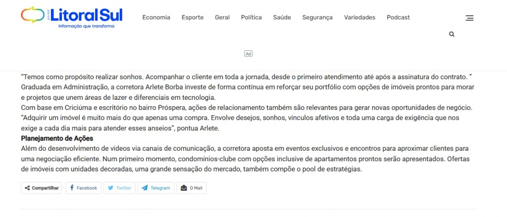 Com base em Criciúma e escritório no bairro Próspera, ações de relacionamento também são relevantes para gerar novas oportunidades de negócio. “Adquirir um imóvel é muito mais do que apenas uma compra. Envolve desejos, sonhos, vínculos afetivos e toda uma carga de exigência que nos exige a cada dia mais para atender esses anseios”, pontua Arlete.