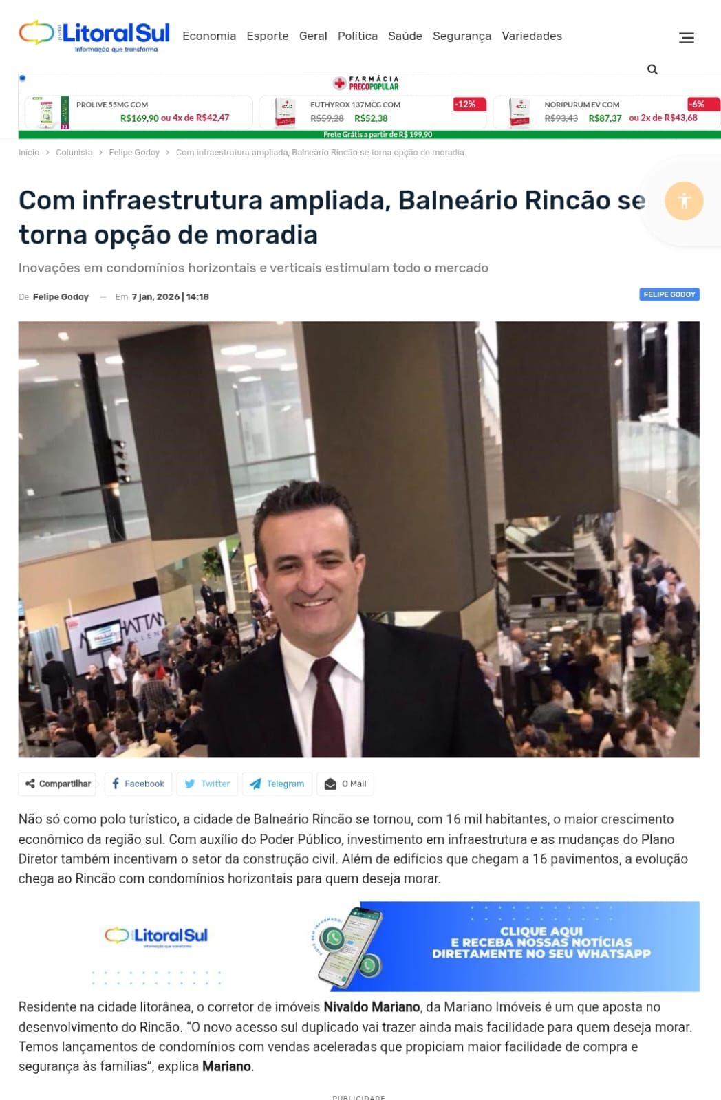 Residente na cidade litorânea, o corretor de imóveis Nivaldo Mariano, da Mariano Imóveis é um que aposta no desenvolvimento do Rincão. “O novo acesso sul duplicado vai trazer ainda mais facilidade para quem deseja morar. Temos lançamentos de condomínios com vendas aceleradas que propiciam maior facilidade de compra e segurança às famílias”, explica Mariano.